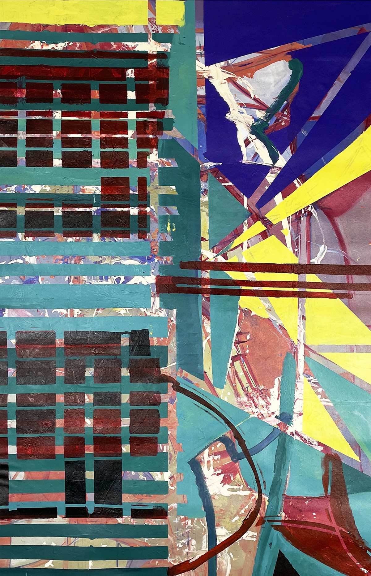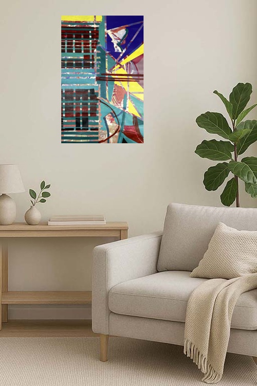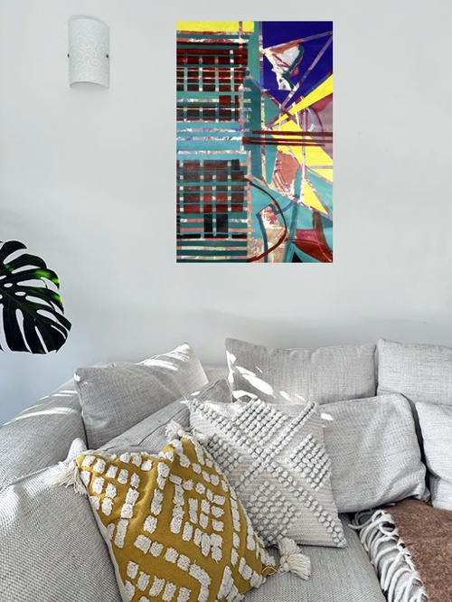 This artwork Framing desire by Beata Kozlowska features an abstract composition with bold lines and bright colors. The image is dominated by shades of blue, yellow, and red, creating a sense of energy and movement. It appears to be an expression of abstract art, exploring themes of desire and perhaps, the chaotic nature of modern life. The lines intersect in ways that could symbolize the complexity of human desires and how they may converge or conflict.