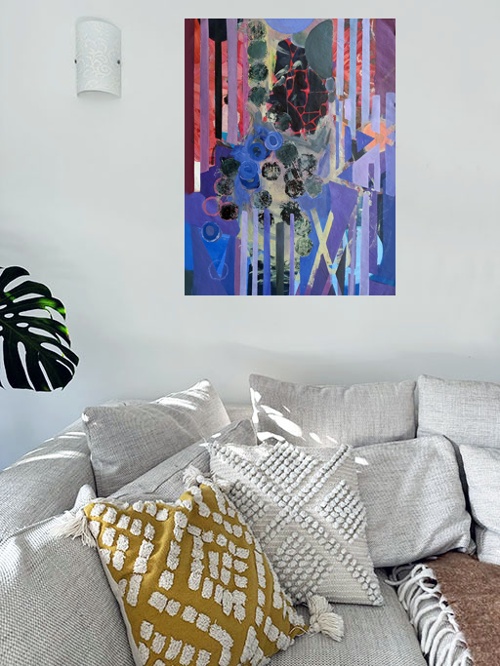 This artwork “In search of Nebulas” by Beata Kozlowska presents a vibrant and abstract art piece featuring a multitude of shapes and colours that seem to blend into one another. The use of various hues and patterns creates a dynamic and somewhat chaotic visual experience, reminiscent of the vastness and mystery of space.