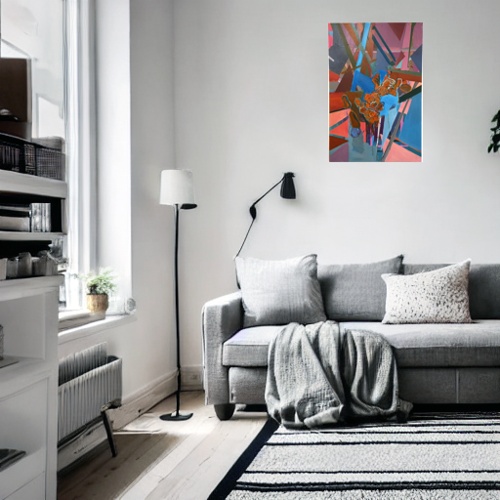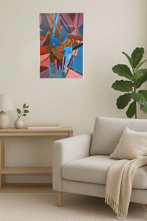 This artwork “Once Upon a Time” by Beata Kozlowska depicts an abstract composition featuring geometric shapes in bold colors. The use of bright reds, blues, and pinks creates a vibrant and dynamic visual effect, reminiscent of a dream or fantasy.