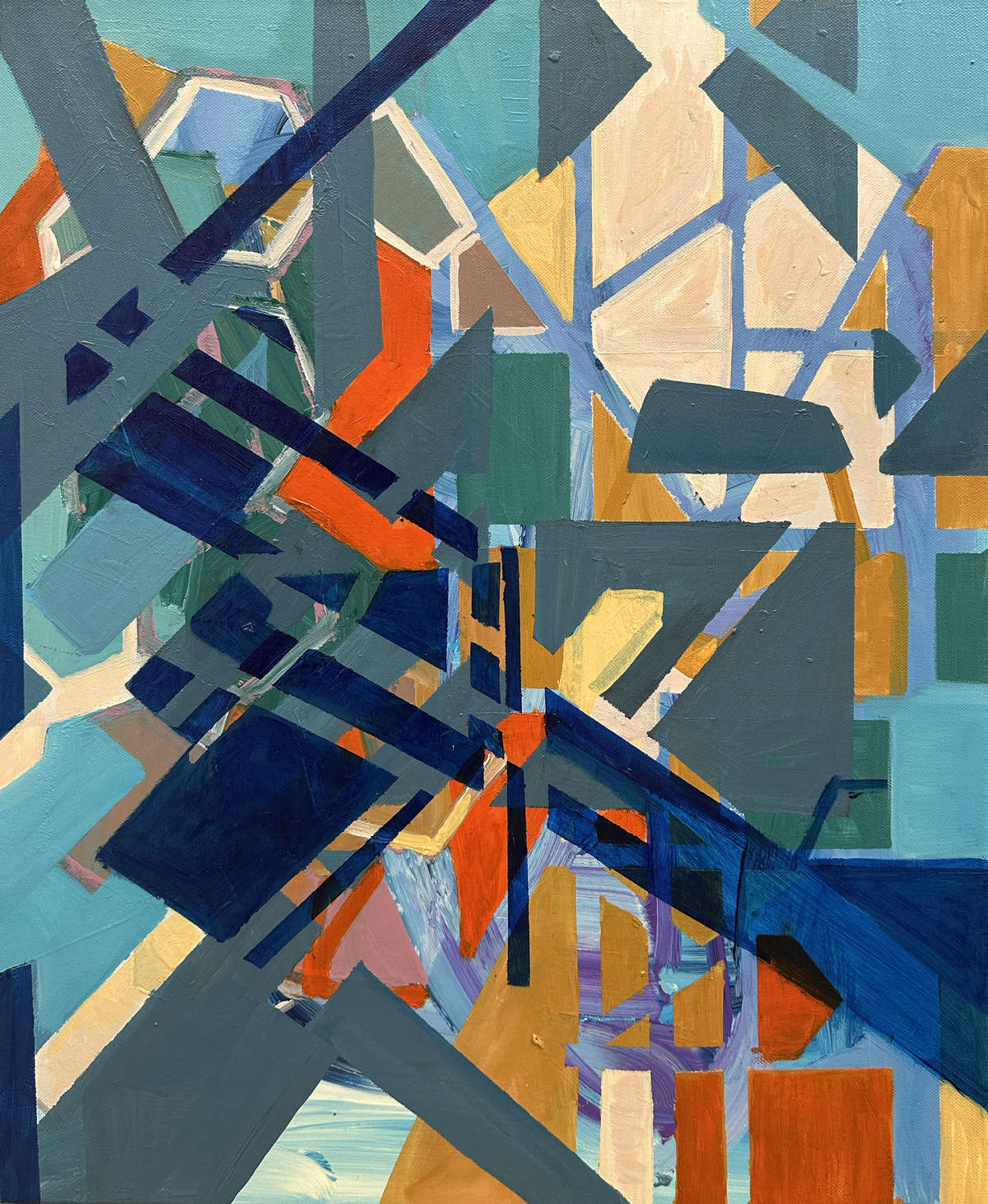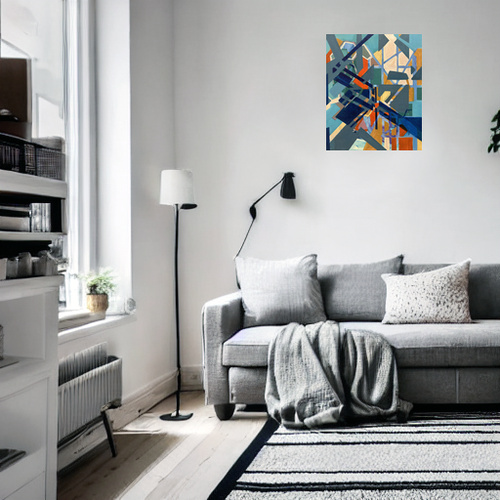 This artwork “Poneke-Journey” by Beata Kozlowska is an abstract piece featuring a mix of geometric shapes in various colours. The art style leans towards cubism with its emphasis on three-dimensional forms. The background is divided into distinct sections, each containing different patterns and hues that seem to blend into the others.