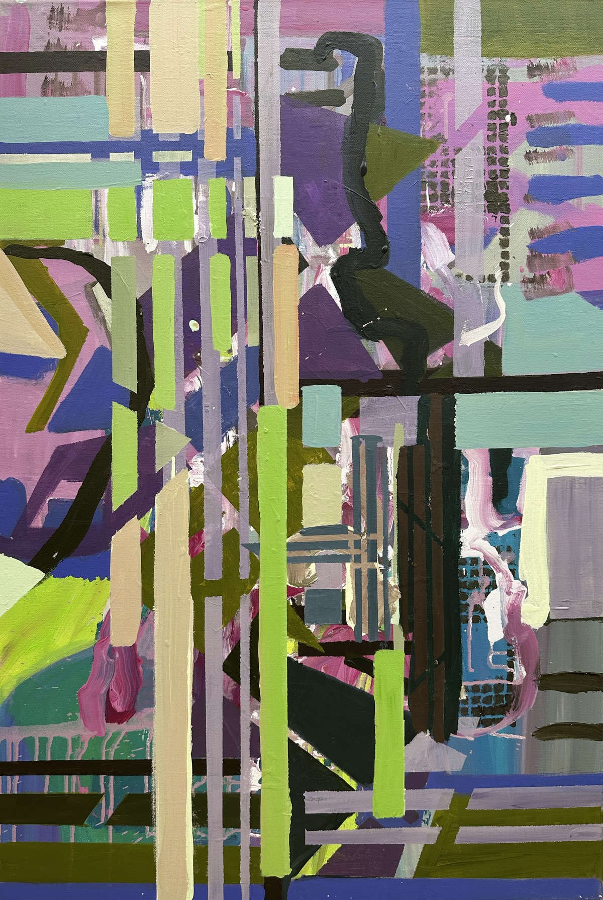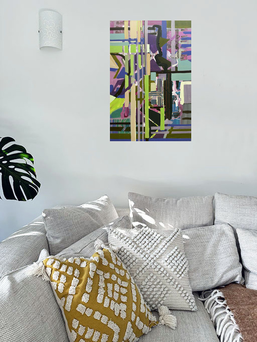 This artwork “Structural Shifting” by Beata Kozlowska presents an abstract composition featuring geometric shapes in varying colours. The art style seems to be influenced by cubism and surrealism, with a focus on spatial illusion and fragmentation.