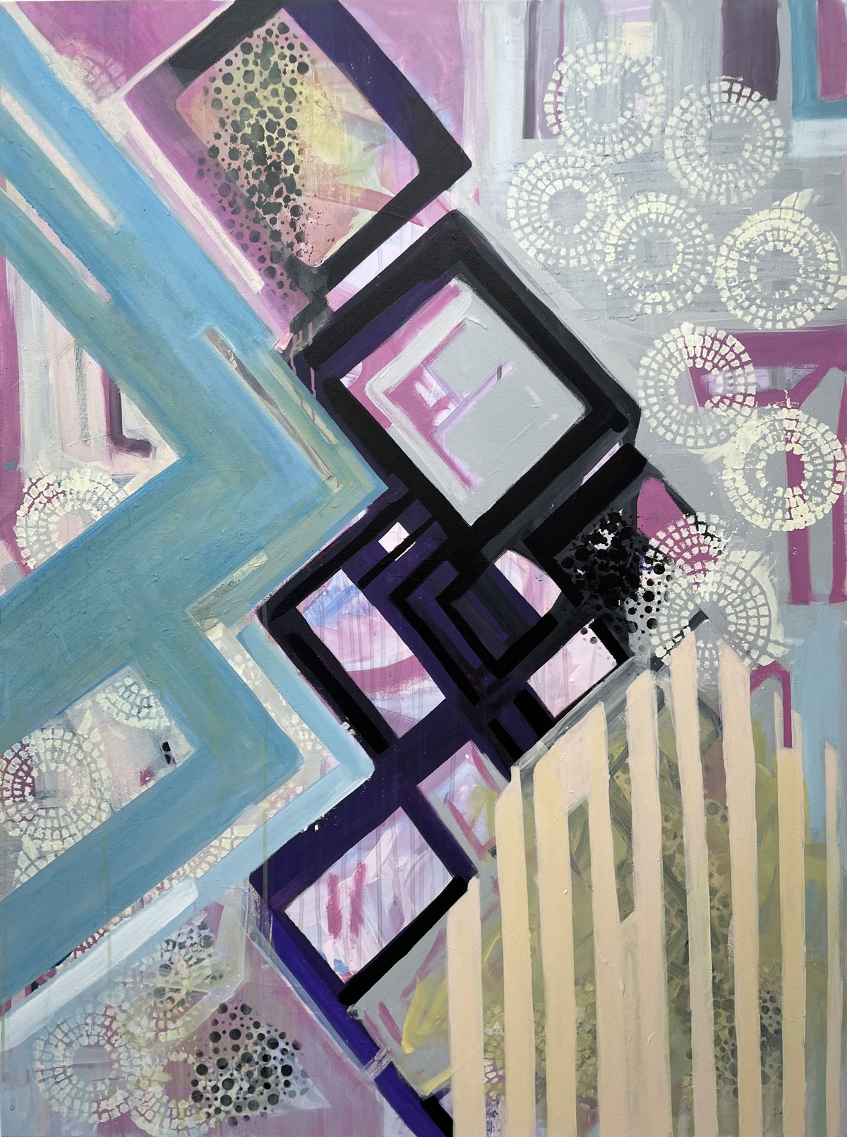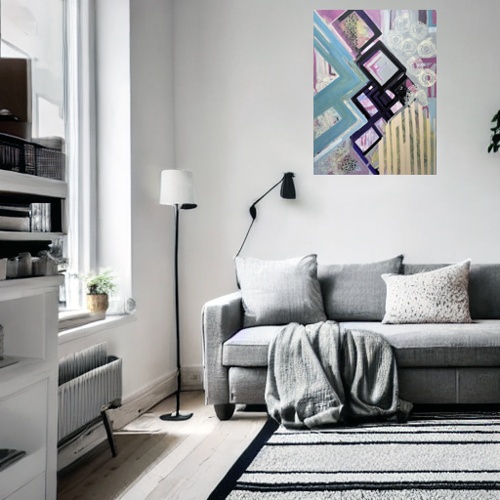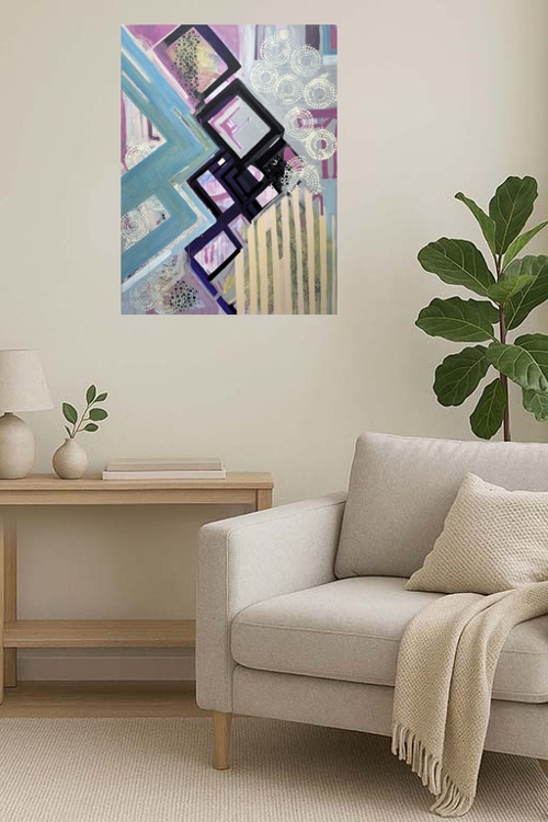 This artwork “Sudden Departure” by Beata Kozlowska features an abstract composition with a colorful, geometric design. It includes various shapes such as circles and rectangles, with patterns and lines connecting them. The palette is diverse, with shades of blue, purple, pink, yellow, and white.