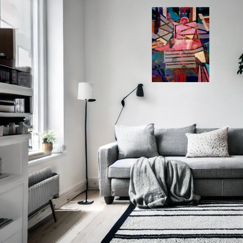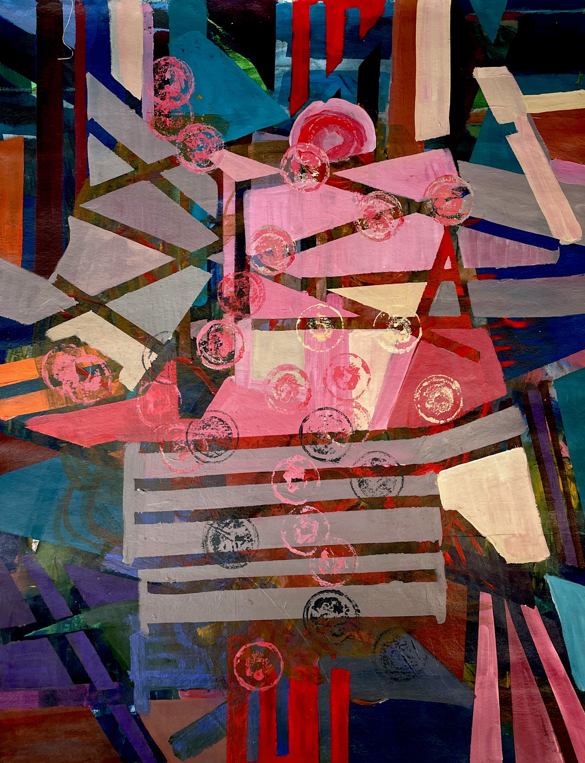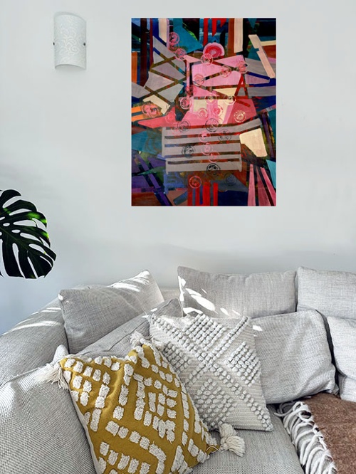 This artwork “Sweet Home and Beyond” by Beata Kozlowska is an abstract piece featuring vibrant colours and various shapes that evoke a sense of chaos. It includes patterns and textures that create depth and complexity, suggesting a multi-layered narrative or emotions. The use of bold colours and contrasting elements indicates a strong influence of surrealism or expressionism in the artist’s approach.