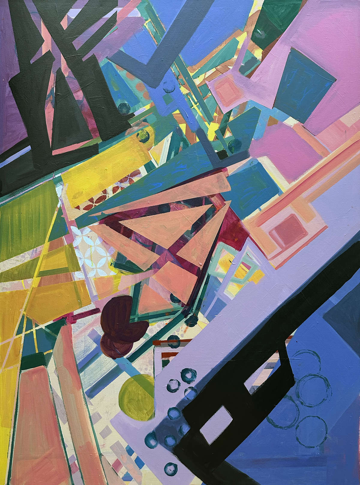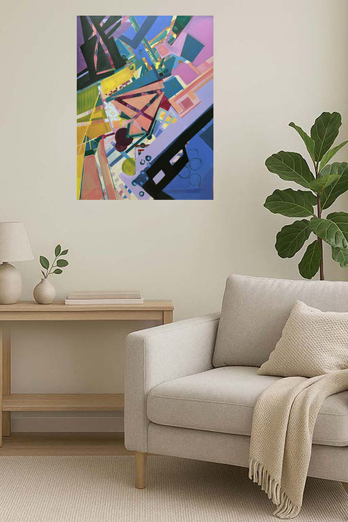 This artwork Untitled by Beata Kozlowska is an abstract piece featuring bright colours, geometric shapes, and a multitude of objects. The composition has a dreamlike quality, with various elements seemingly floating in the air.