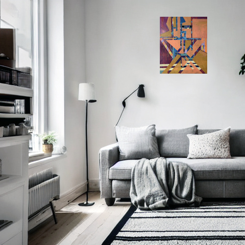 This artwork Untitled by Beata Kozlowska is an abstract piece featuring geometric shapes in shades of blue, orange, and white. The art style leans towards modernism, with a focus on colour and form. The meaning behind the painting could be open to interpretation; however, it may suggest a complex or chaotic system of patterns, possibly representing the idea of connection or disconnection within a larger context or community.