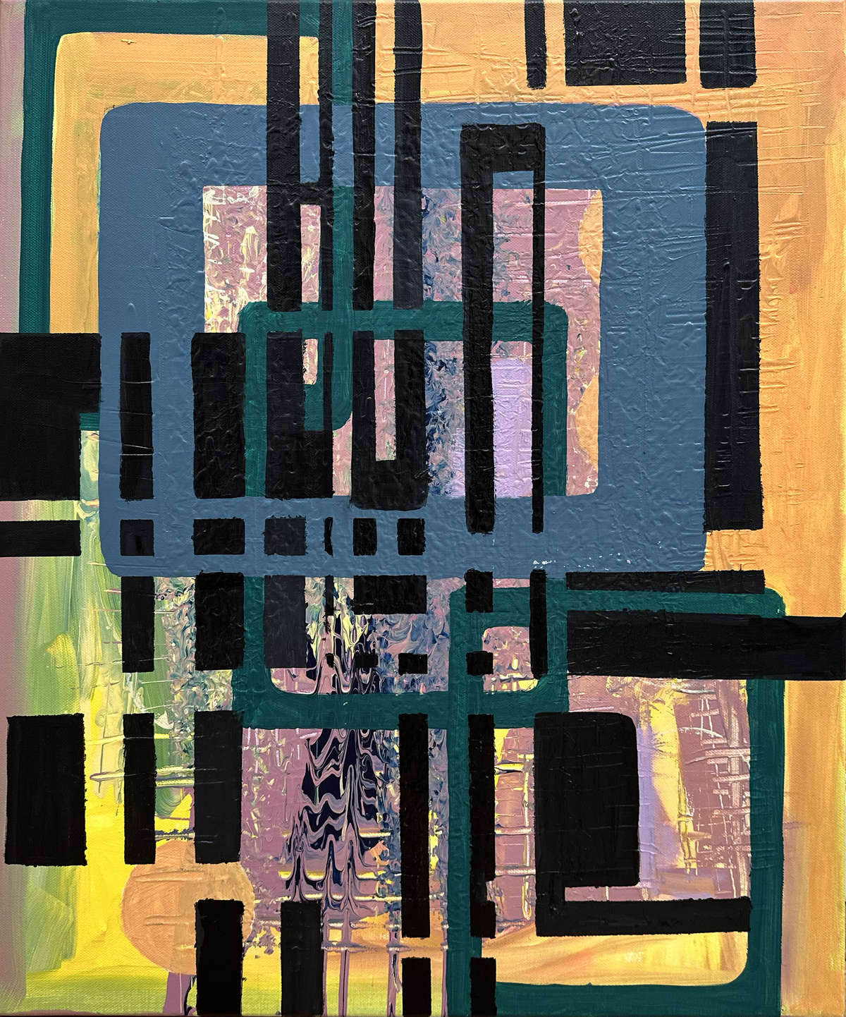 This artwork Untitled by Beata Kozlowska features an abstract geometric composition in shades of blue and green. The use of solid shapes creates a dynamic visual effect, with a colour palette dominated by cool tones.