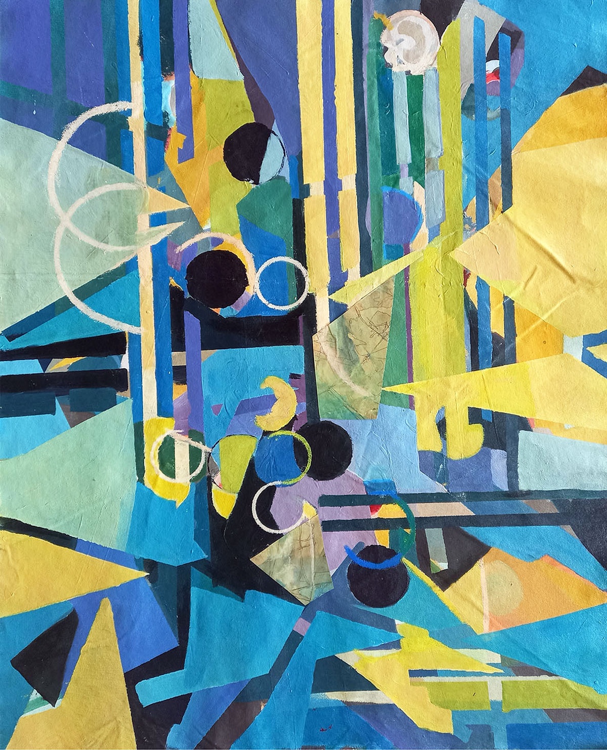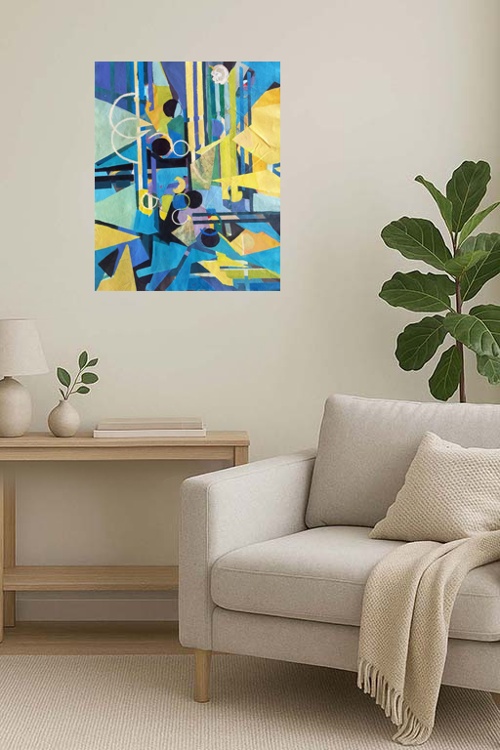 This artwork “Within Reach” by Beata Kozlowska portrays an abstract scene with various geometric shapes in shades of yellow, blue, and green. The composition is complex yet harmonious, with the use of line and shape creating a sense of depth and movement.